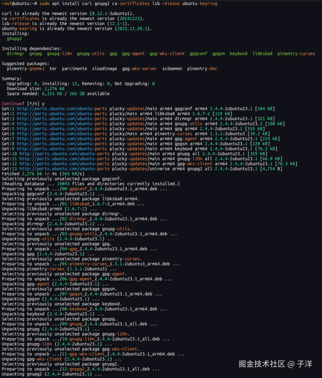 curl- 用于下载文件gnupg2- GNU隐私保护工具,用于密钥管理ca-certificates- 证书授权文件lsb-release- 提供Linux发行版信息ubuntu-keyring- Ubuntu的GPG密钥环
