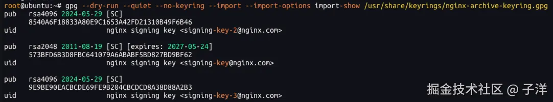 gpg --dry-run --quiet --no-keyring --import --import-options import-show /usr/share/keyrings/nginx-archive-keyring.gpg