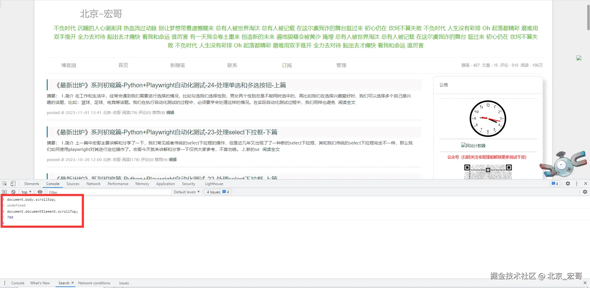 宏哥在这里直接就用博客园的滚动条给小伙伴或者是童鞋们来实战演示一下,大家可以注意宏哥录制浏览器动作视频的滚动条在向下滚动直到博客园的底部。