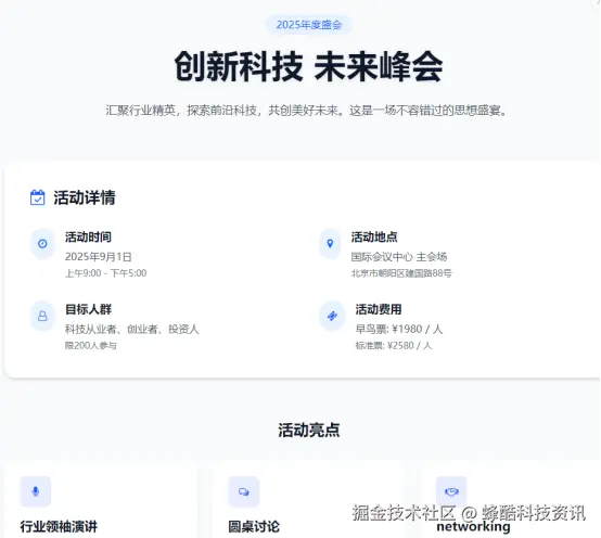 结果真有点出乎意料,大概也就十分钟左右吧,它真的给我“吐”出来一份完整的HTML和CSS代码!我赶紧在浏览器里打开预览,嘿,框架搭得有模有样!大标题的字体大小会自己适应屏幕,时间和地点清清楚楚分两行排着,几个亮点用列表展示出来,间距看着挺舒服,报名按钮是蓝底白字,鼠标放上去还会变亮一点,正是我想要的那种清爽感觉。