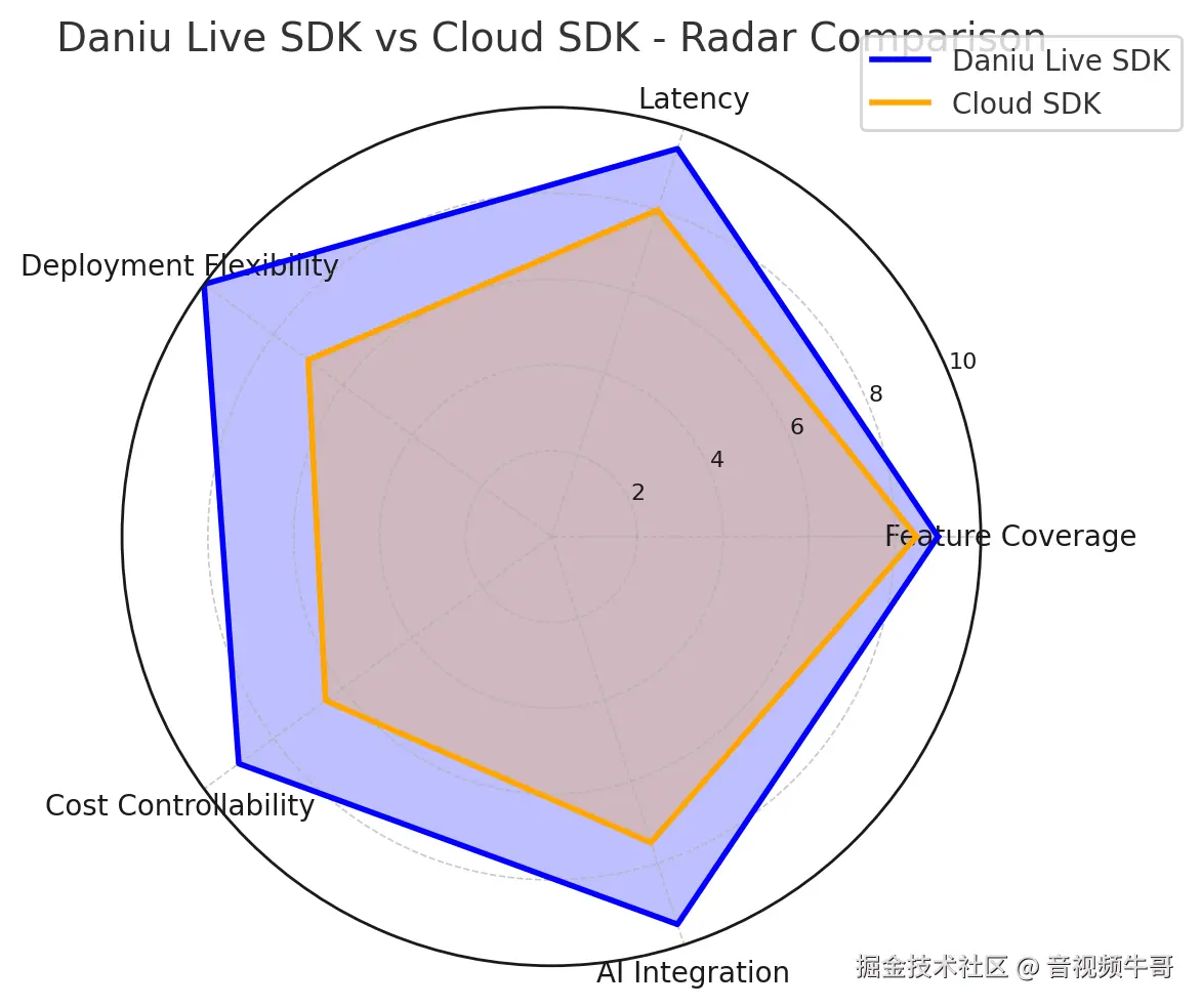 从雷达图可以看到,本地部署 SDK 在延迟、部署灵活性、成本可控性、AI适配度四个维度上占据明显优势,功能覆盖度也略高于云SDK。