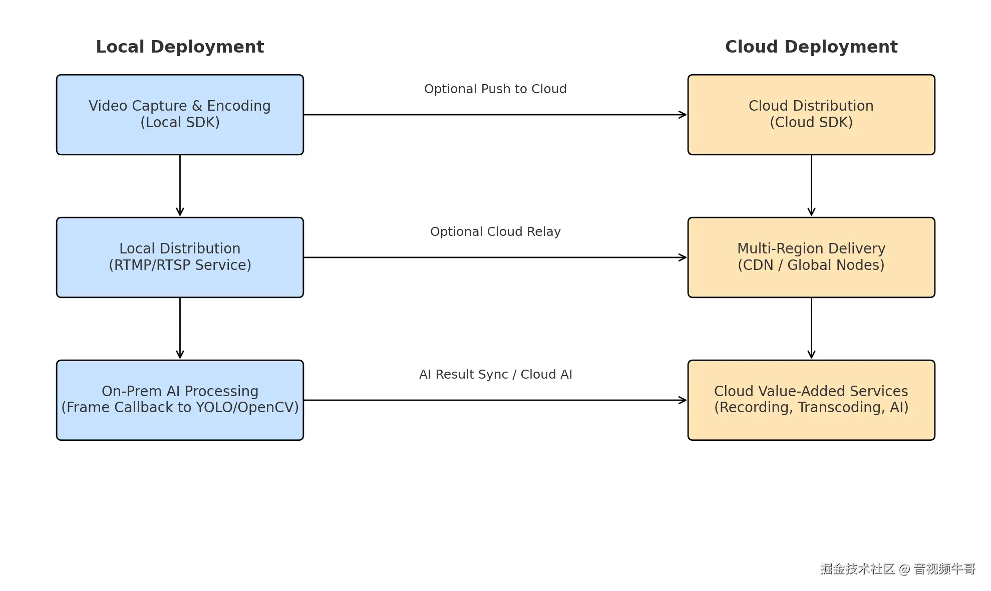 云SDK:可对接云端 AI 服务,本地 AI 对接需额外拉流,增加延迟与带宽开销。