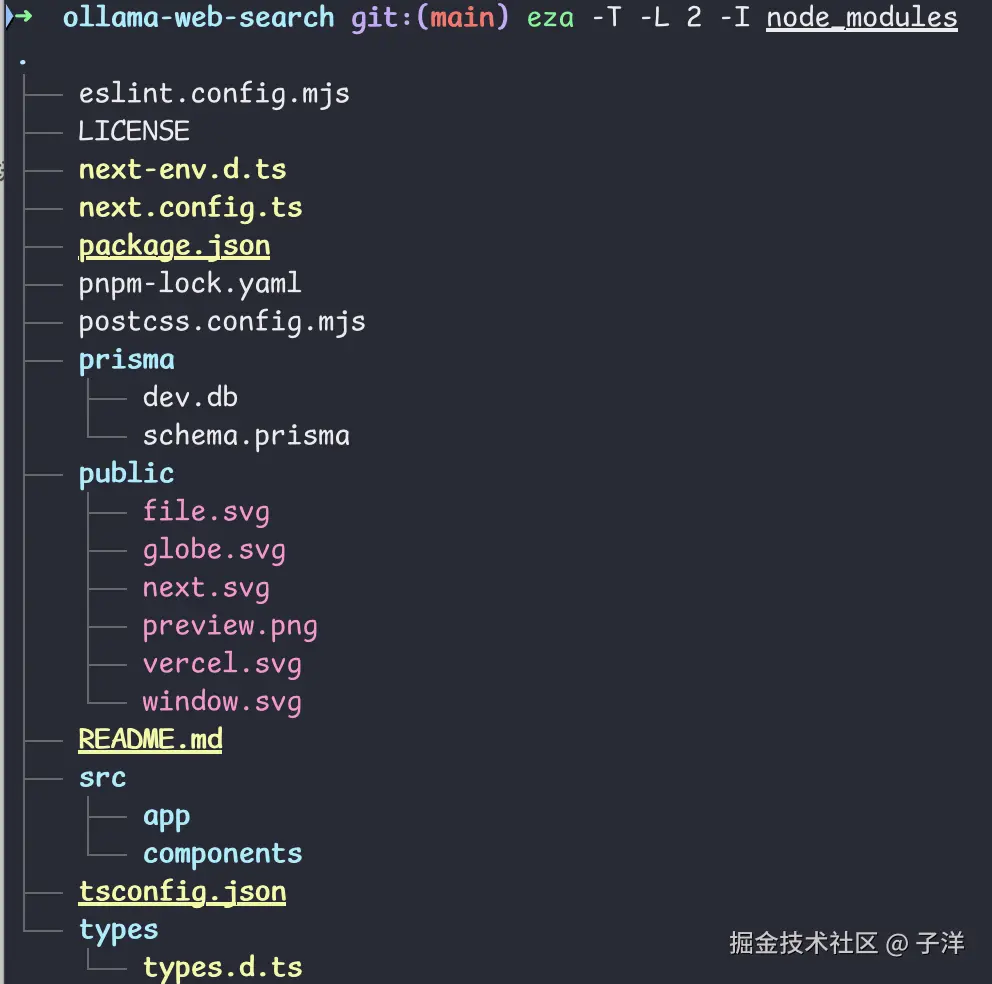 -T表示以树状结构输出目录;-L表示树的层级,这里指定显示 2 层;-I表示忽略的目录或文件,这里我忽略了 node_modules,懂得都懂。