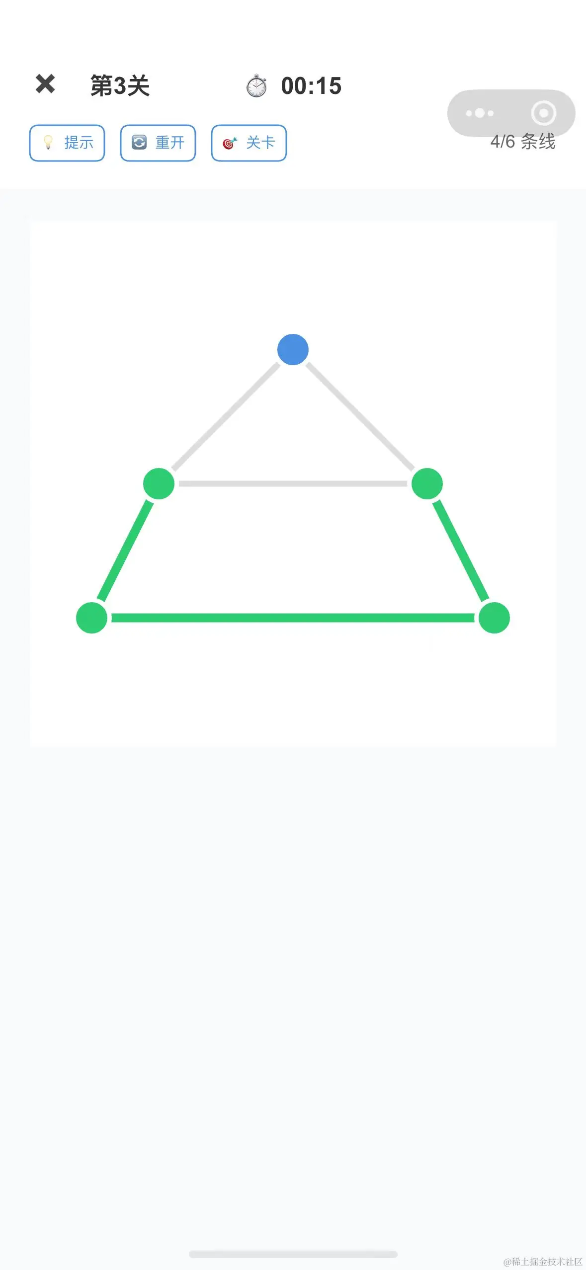 到这里,我们就得到了一个看起来还行的一笔画小游戏。全部过程中只通过语言表达,没有写一行代码。你也可以继续通过自然语言继续拓展功能,比如关卡的本地存储、提示、游戏关卡的设计等。都可以通过聊天的形式让 AI 帮你完成,完善一下,你也可以将小游戏上架哦 ~