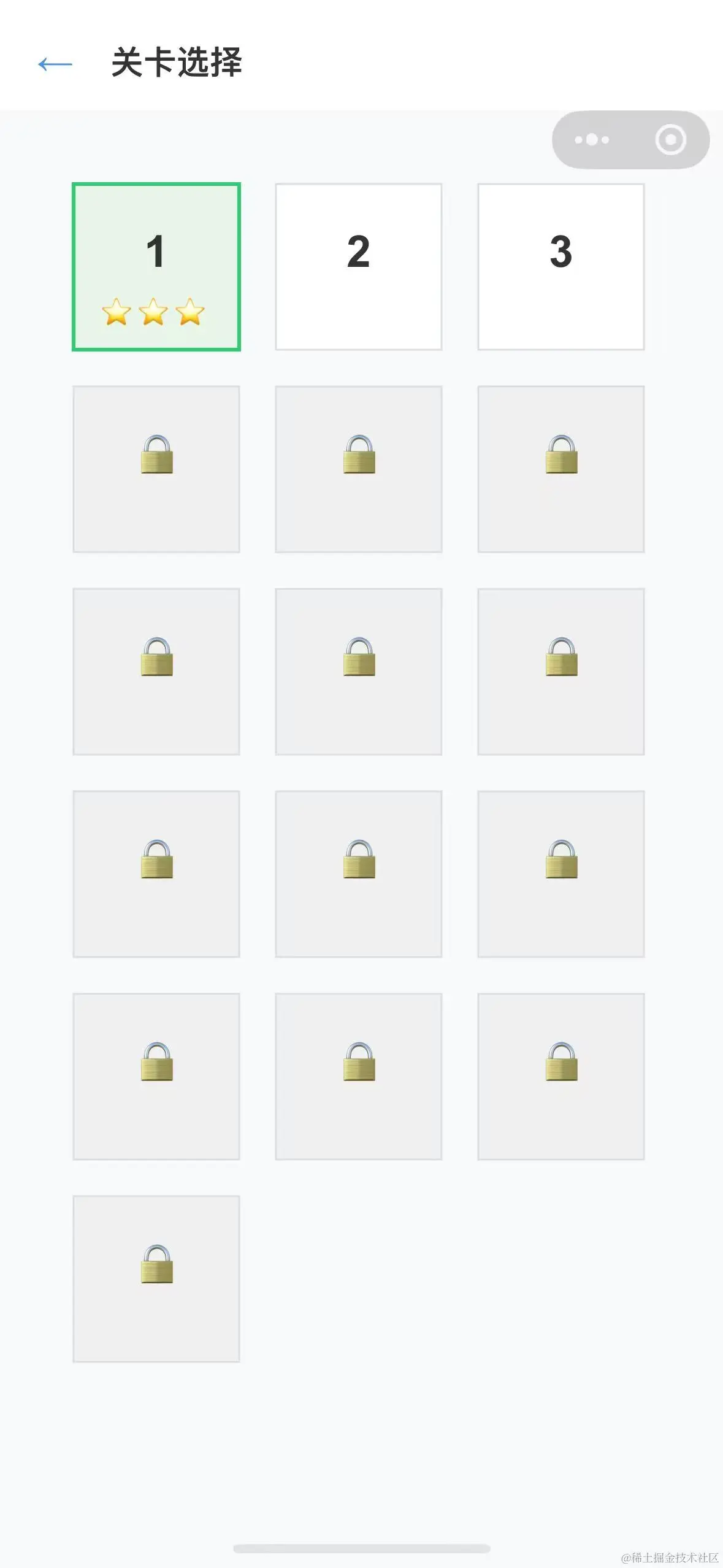 选择关卡也参考游戏界面的 HUD,避免顶部状态栏遮挡,也通过叉号返回。关卡列表条目使用圆角矩形.