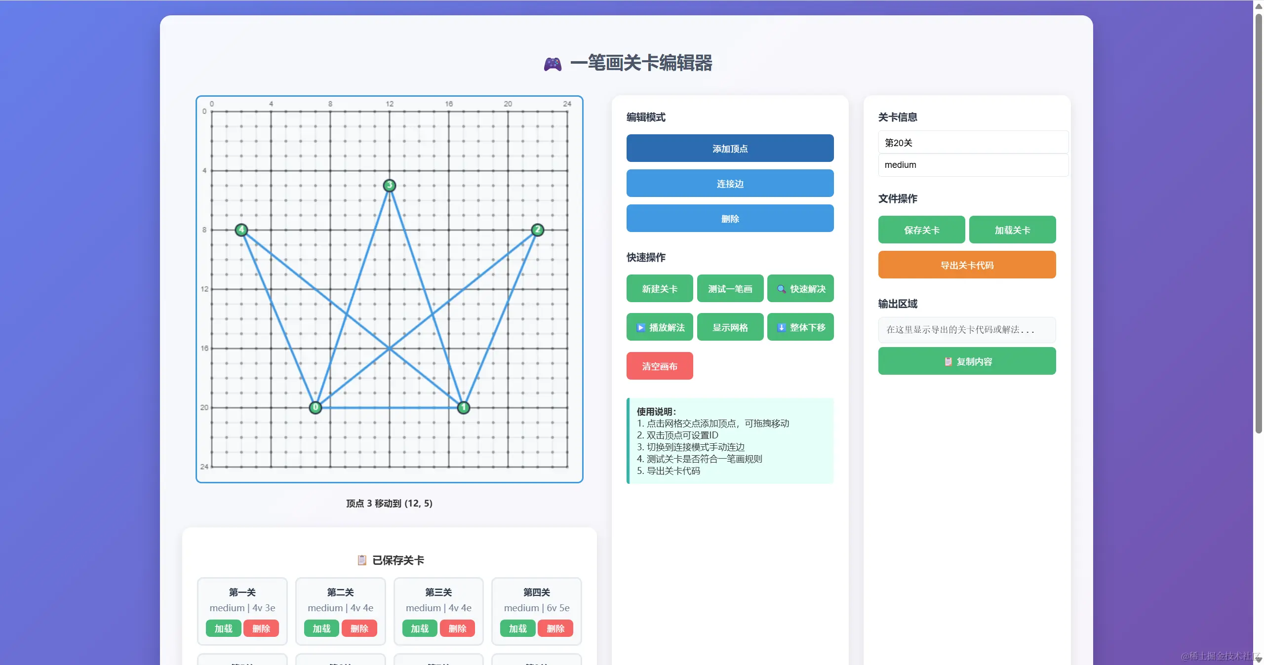 对于匠心千游而言,我还通过 AI 为一笔画设计了 关卡编辑器,作为关卡数据来源。这个编辑器也是和 AI 沟通完成的,没有手写写任何代码,效果我是非常满意的。