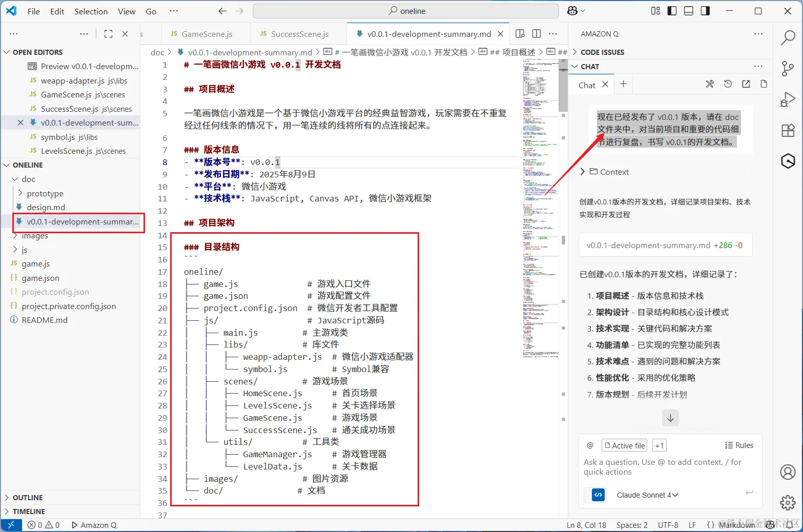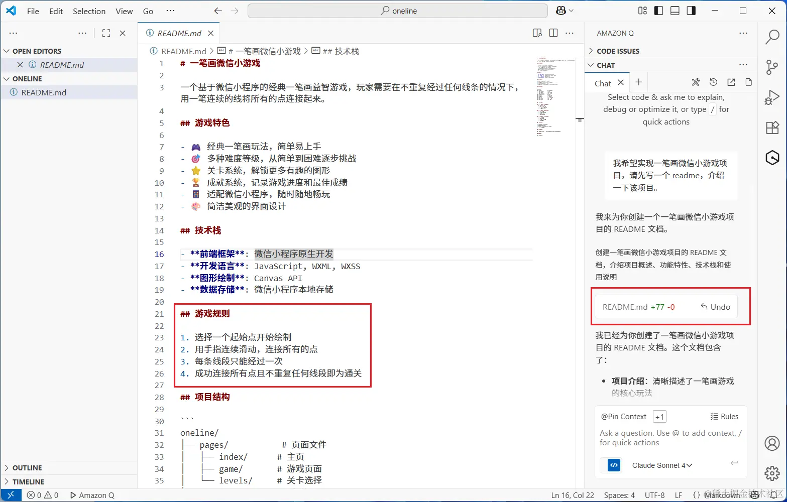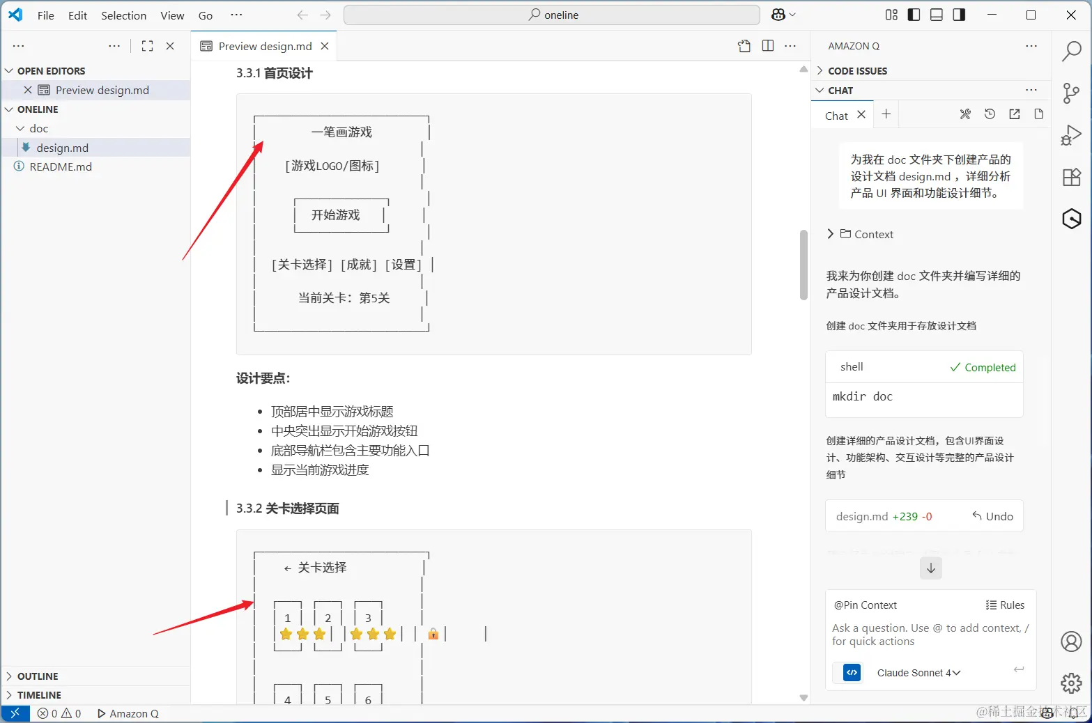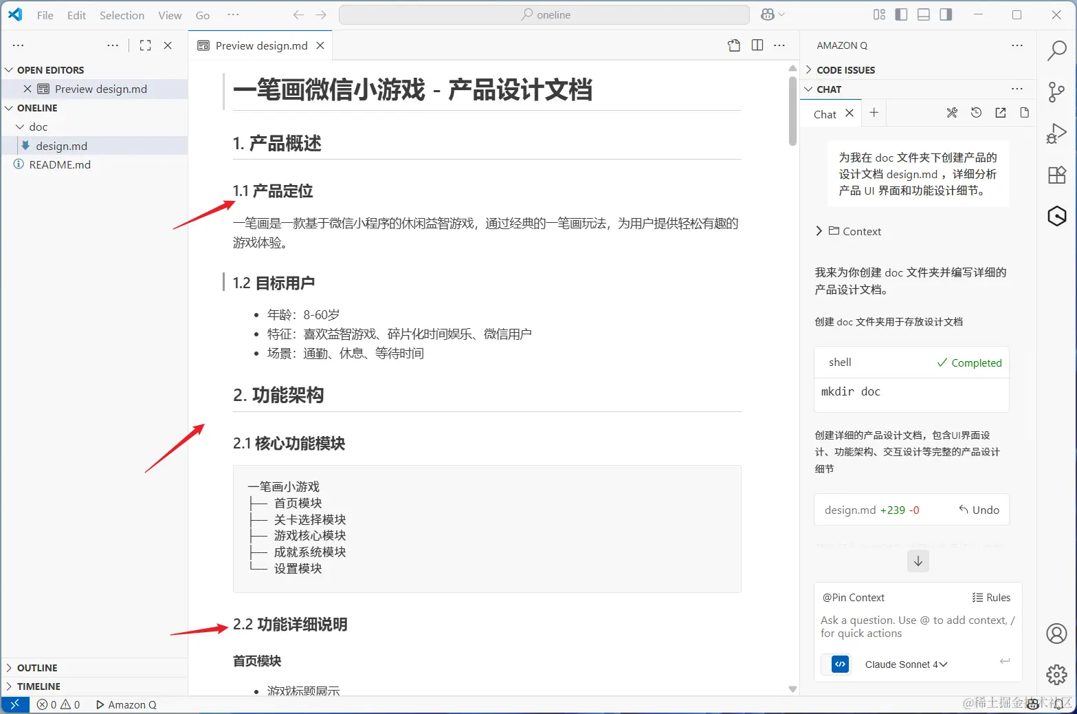 此时 AI 会为你创建并生成 Readme.md 的文档。这里主要查看一下他是否理解了你的需求,看游戏规则是否和你想的一样。