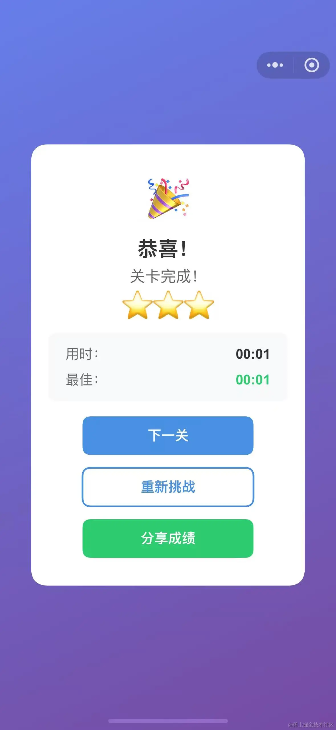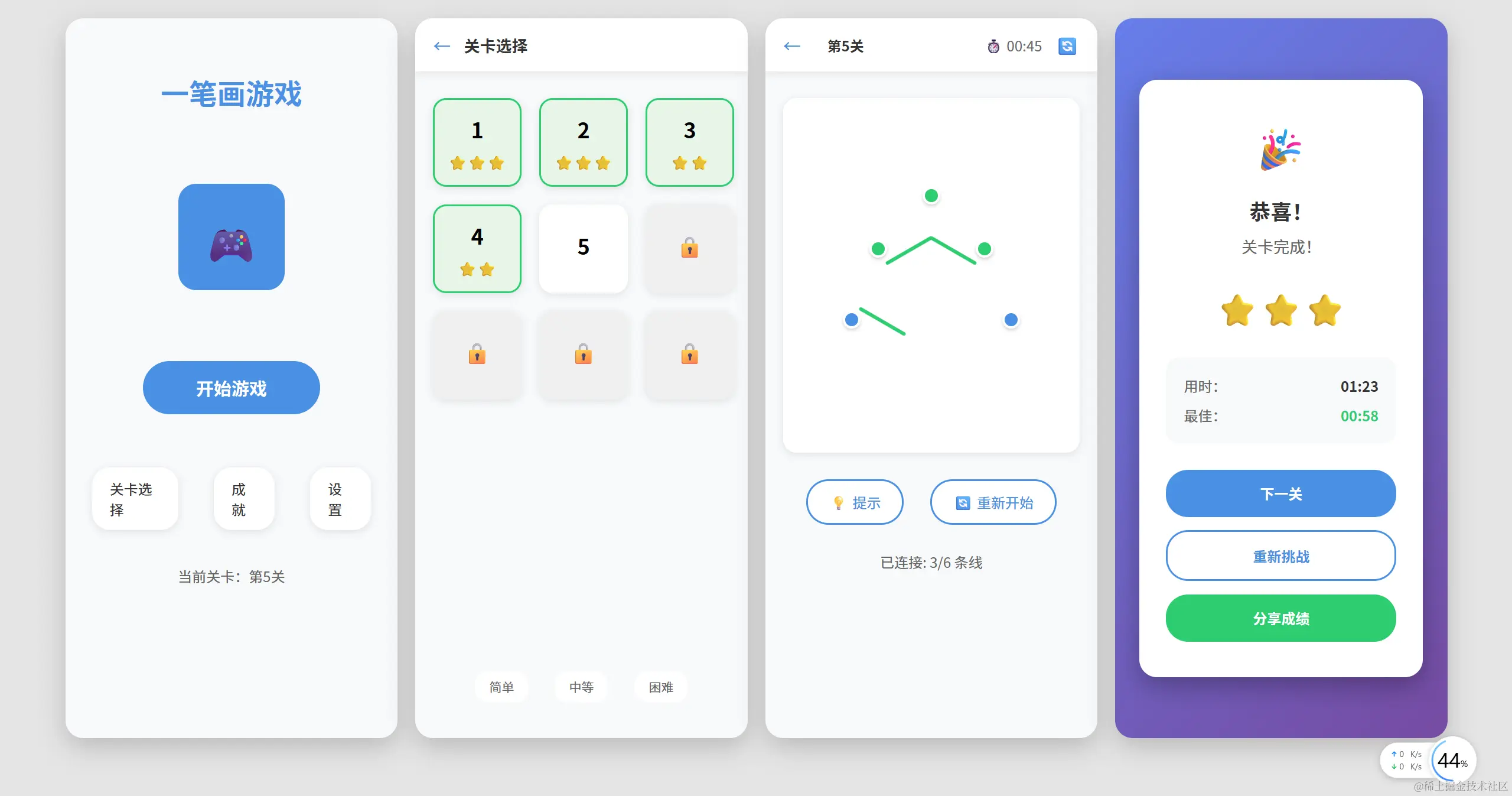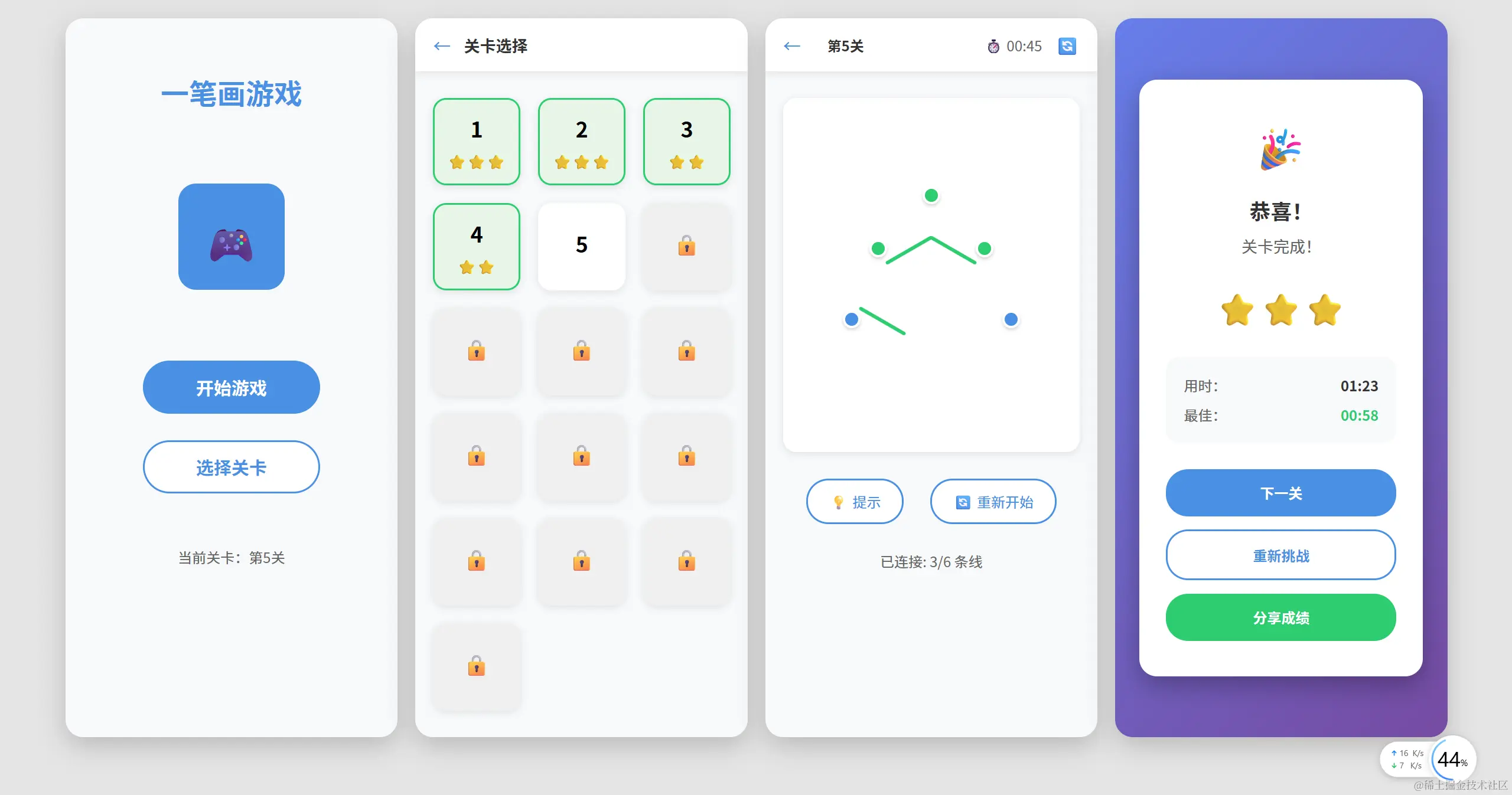 | 游戏界面 | 完成界面 | 关卡选项 |