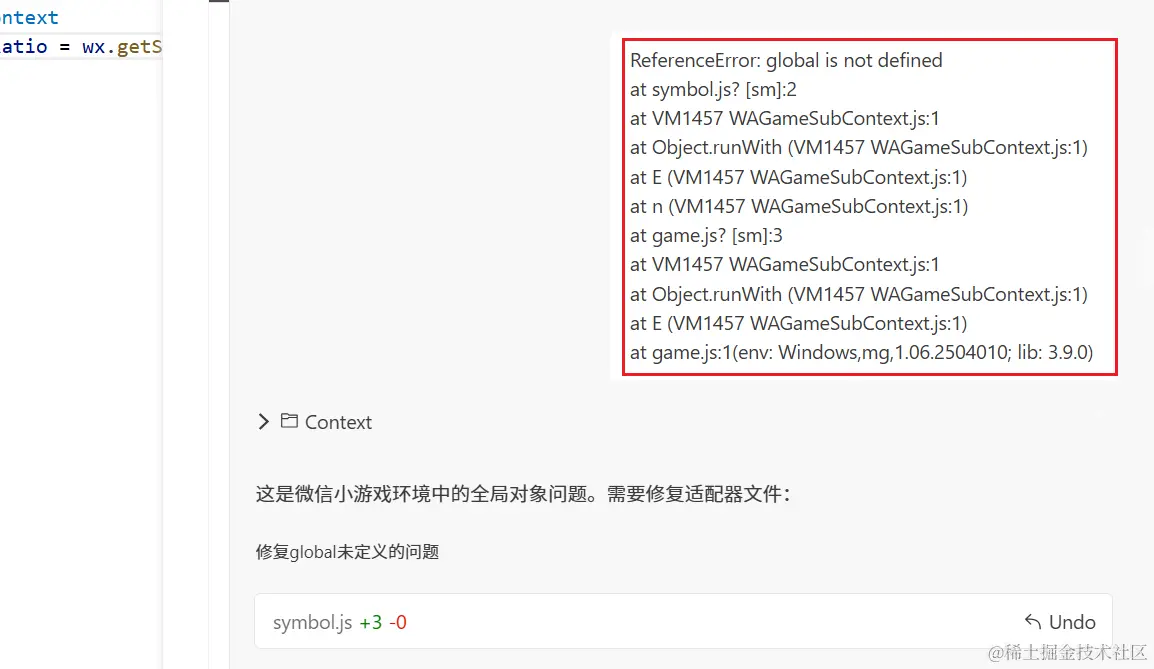 这里就要考验各家 AI 的代码能力了,如果打开后有什么错误,都可以复制到 AI 编程工具里让它自行修改。比如我这里有个 ReferenceError: global is not defined 的编译异常,可以把它给 AI 让它自己修改: