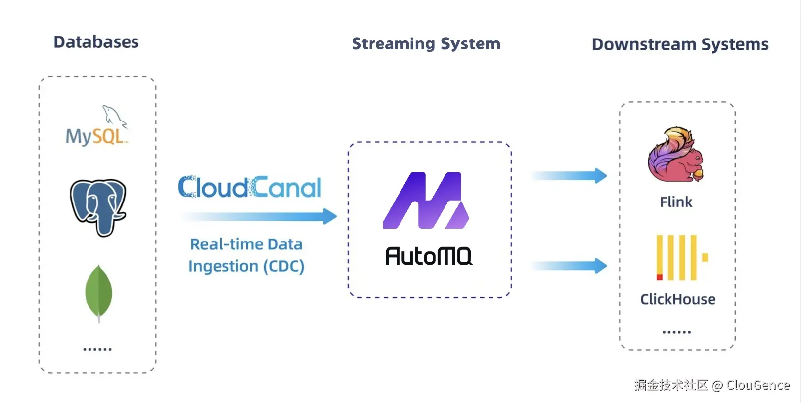 为此,CloudCanal 与 AutoMQ 联合提出了一套覆盖全链路的数据流通方案,从数据采集、变更同步,到高性能消息传输与实时消费,实现业务数据库到流处理平台的无缝对接: