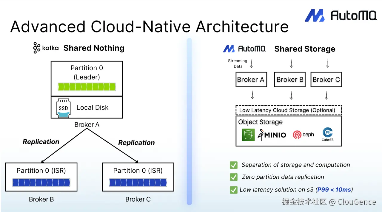 得益于共享存储架构,AutoMQ 实现了计算与存储的真正分离,具备更高的性能、更强的可扩展性与更低的运维成本。相比传统 Kafka,AutoMQ 在云上更易部署、更易管理,正在成为云原生环境下的理想替代方案。