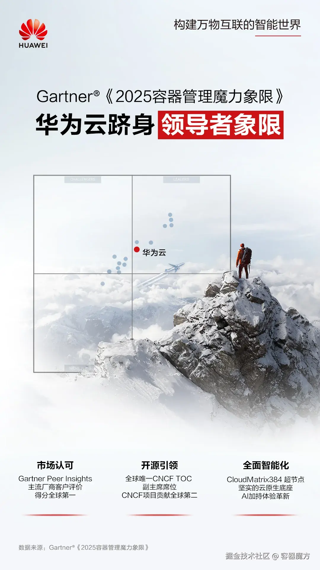 8月6日,Gartner正式发布2025《容器管理魔力象限》报告,华为云进入领导者象限。根据Gartner Peer Insight客户评价系统最新数据,华为云容器获得全球客户认可得分4.7分,在参评厂商中排名第一。我们相信,此次入选得益于华为云对云原生2.0的深入践行和战略投入,在业界率先发布CCE Turbo、CCE Autopilot、云容器实例CCI以及分布式云原生服务UCS等多款创新性容器产品,为用户提供可在公有云、分布式云、混合云、边缘运行大规模可扩展容器负载的最佳云原生基础设施。