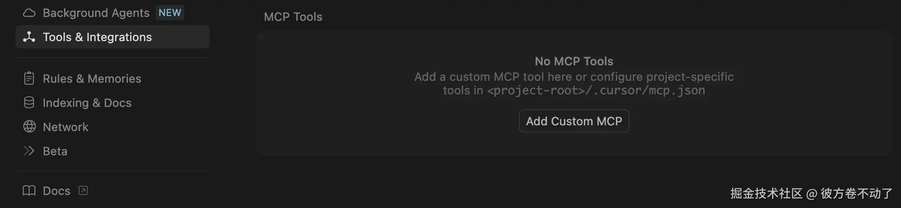 打开 Cursor,进入 Preferences > Cursor Settings > Tools & Integrations,点击 Add Custom MCP 按钮: