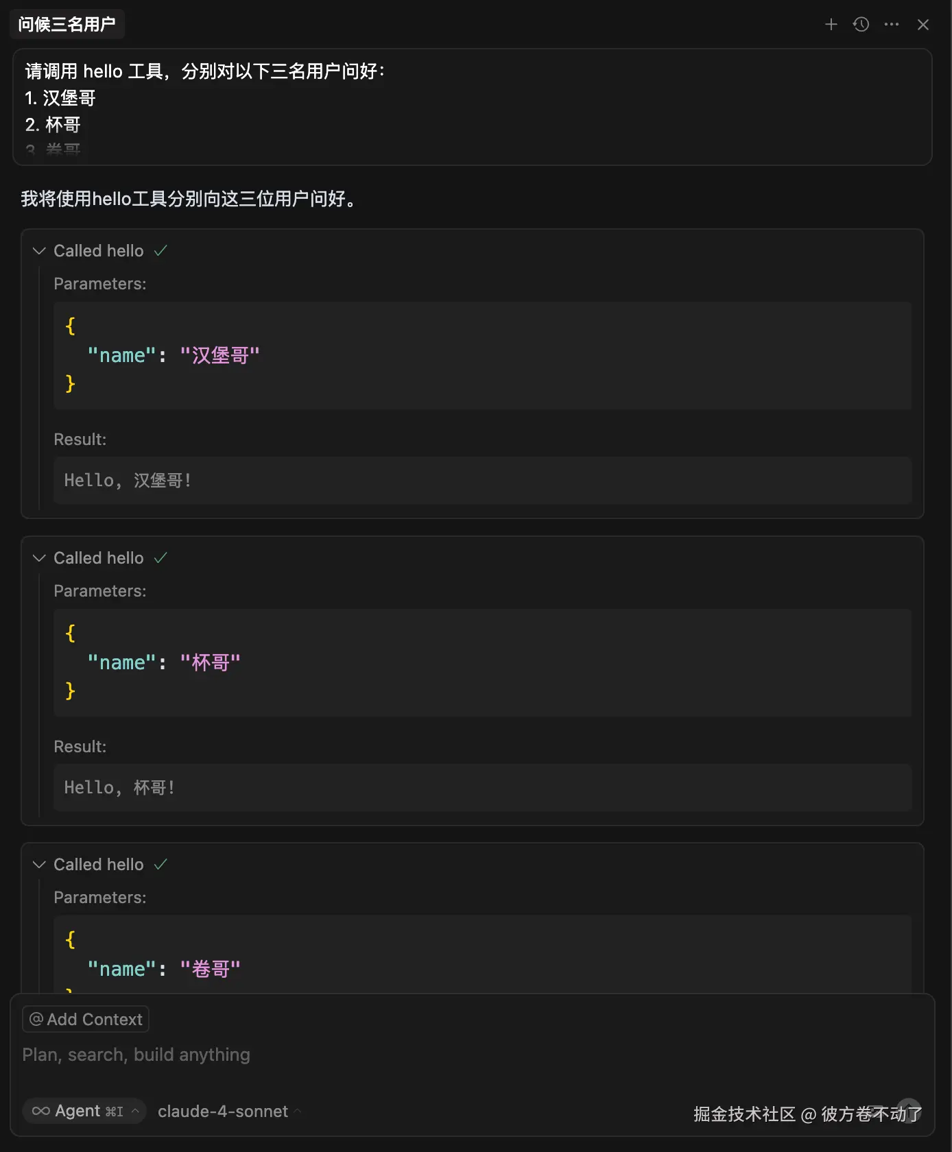 接下来打开 Agent 模式,让 LLM 调用我们的工具,分别对三名用户问好: