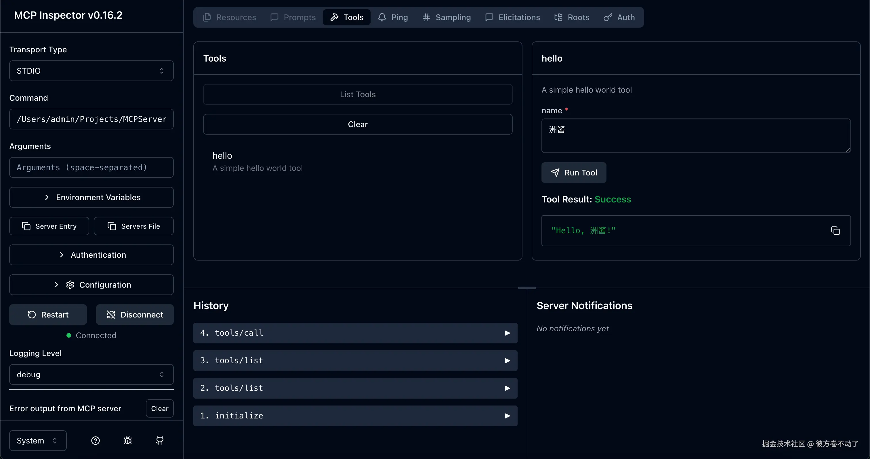点击 Connect 按钮,服务器会自动连接上,然后就可以在 Tools 窗口中测试之前写好的 hello 工具了: