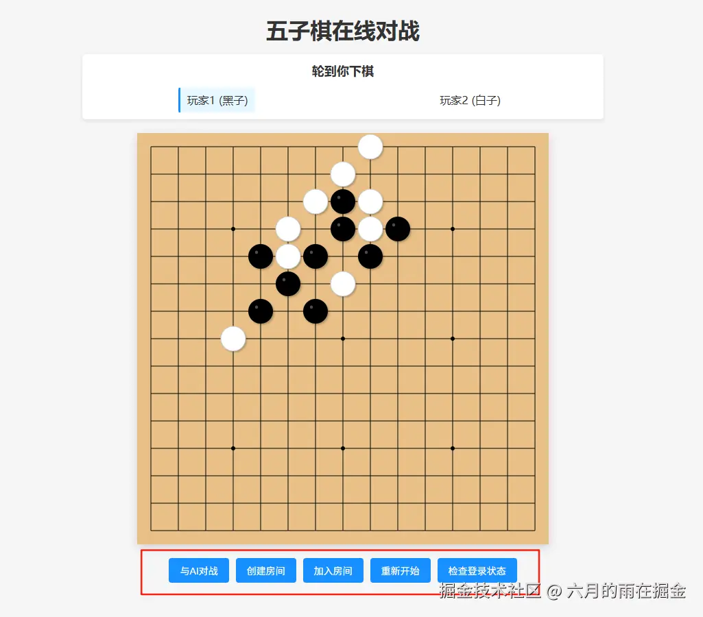 对于页面的调整,通过文字描述的方式可能并不能让AI 立刻明白你想要的效果,那么就可以采用像问题处理时的方法,通过页面截图搭配Prompt 提示词的方式来准确告诉 AI 我们想要的效果。比如下面我具体的按钮放在五子棋棋盘下面不太好找,我们可以将按钮调整到棋盘上面