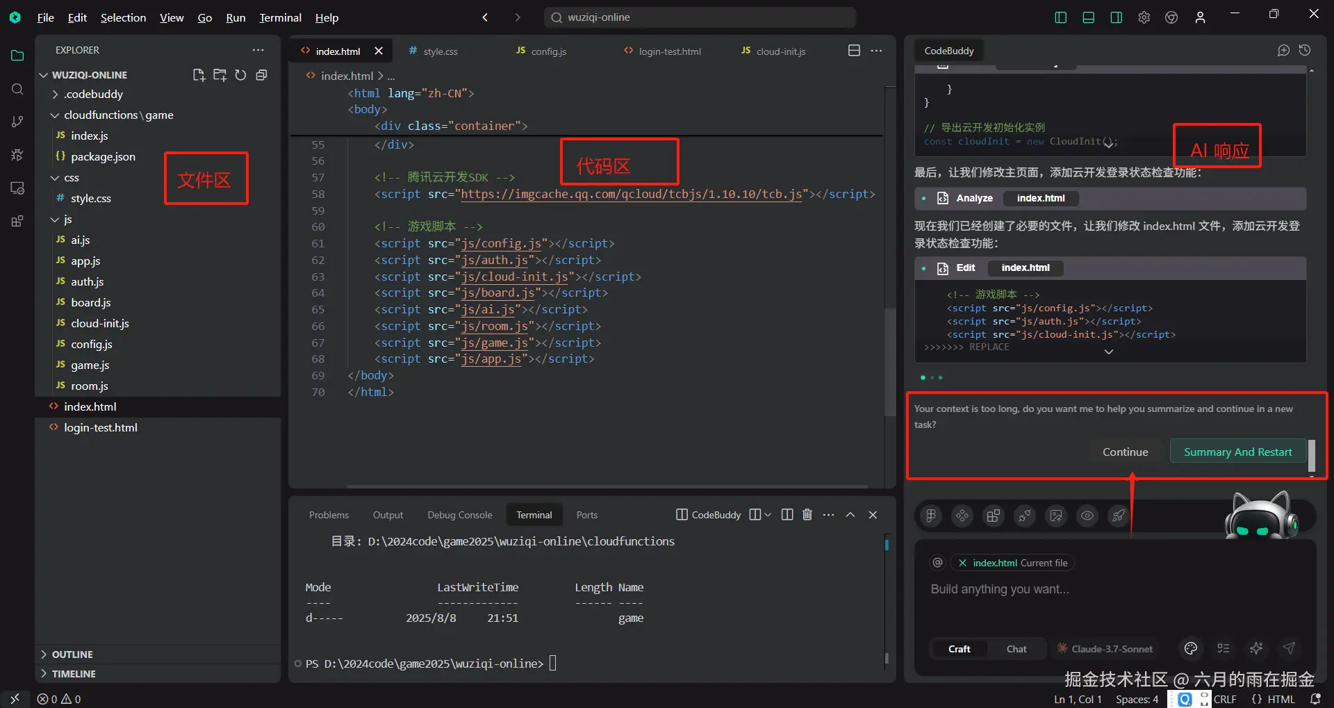 在接收到我们的生成五子棋小游戏的需求之后,AI 会自动根据我们的需求生成对应的文件,以下是CodeBuddy IDE 的界面展示情况,当 AI 响应区遇到途中提示时,这里个人建议点击【Continue】