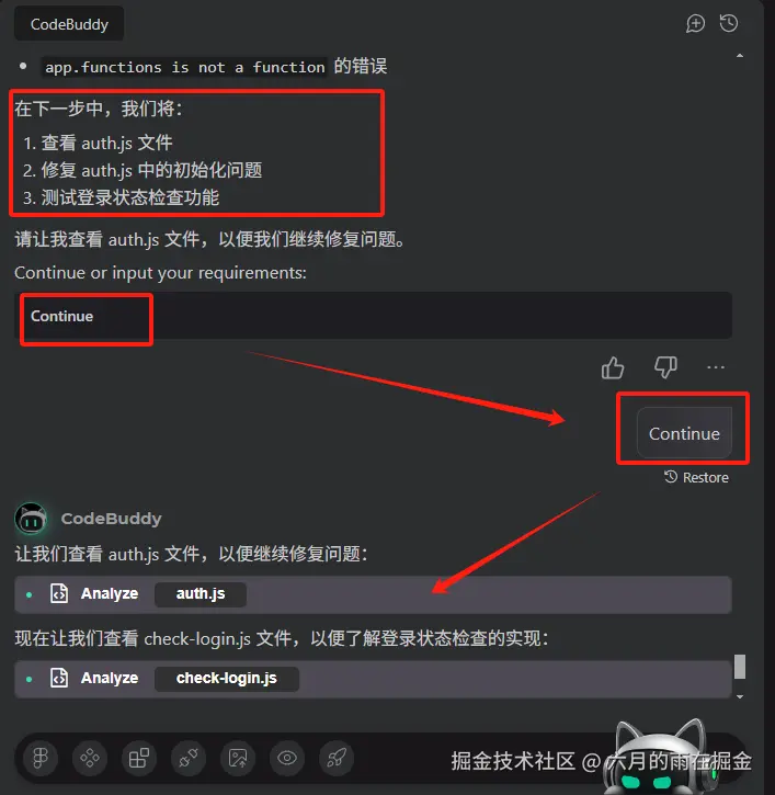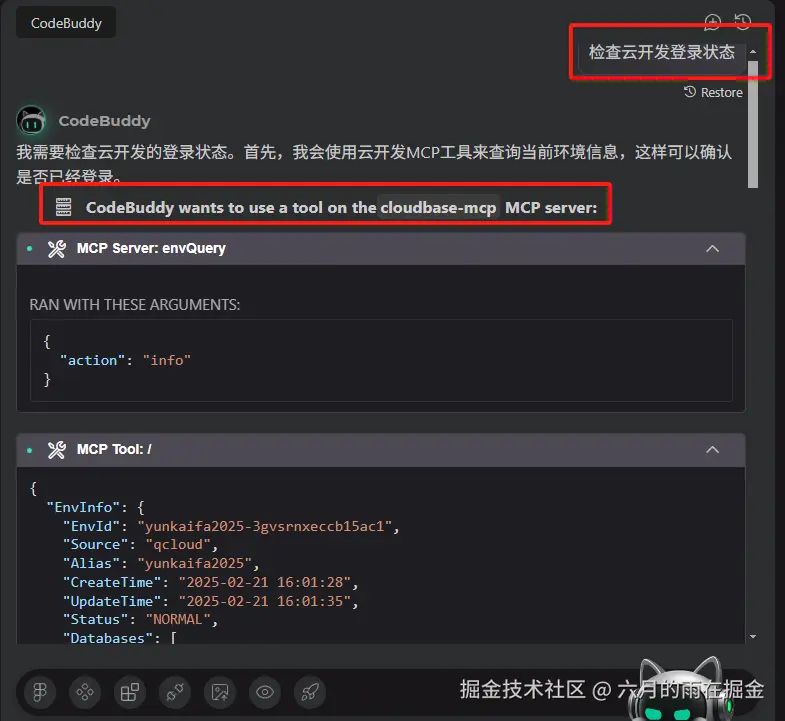 像遇到这种情况的话,就可以直接关掉当前会话开启新会话重新尝试,还是不行的话则需要重启CodeBuddy IDE 开发工具尝试了。这种循环目前不知道什么场景下触发的,官方CodeBuddy IDE 团队也在努力修复。目前对于开发者来说,在遇到这种情况的话,最快的办法就是上面提到的重新开启会话或者是重启 CodeBuddy IDE。需要注意的是,如果你是通过下面这种方式配置的腾讯云CloudBase ,在重启CodeBuddy IDE 之后需要重新授权登录
