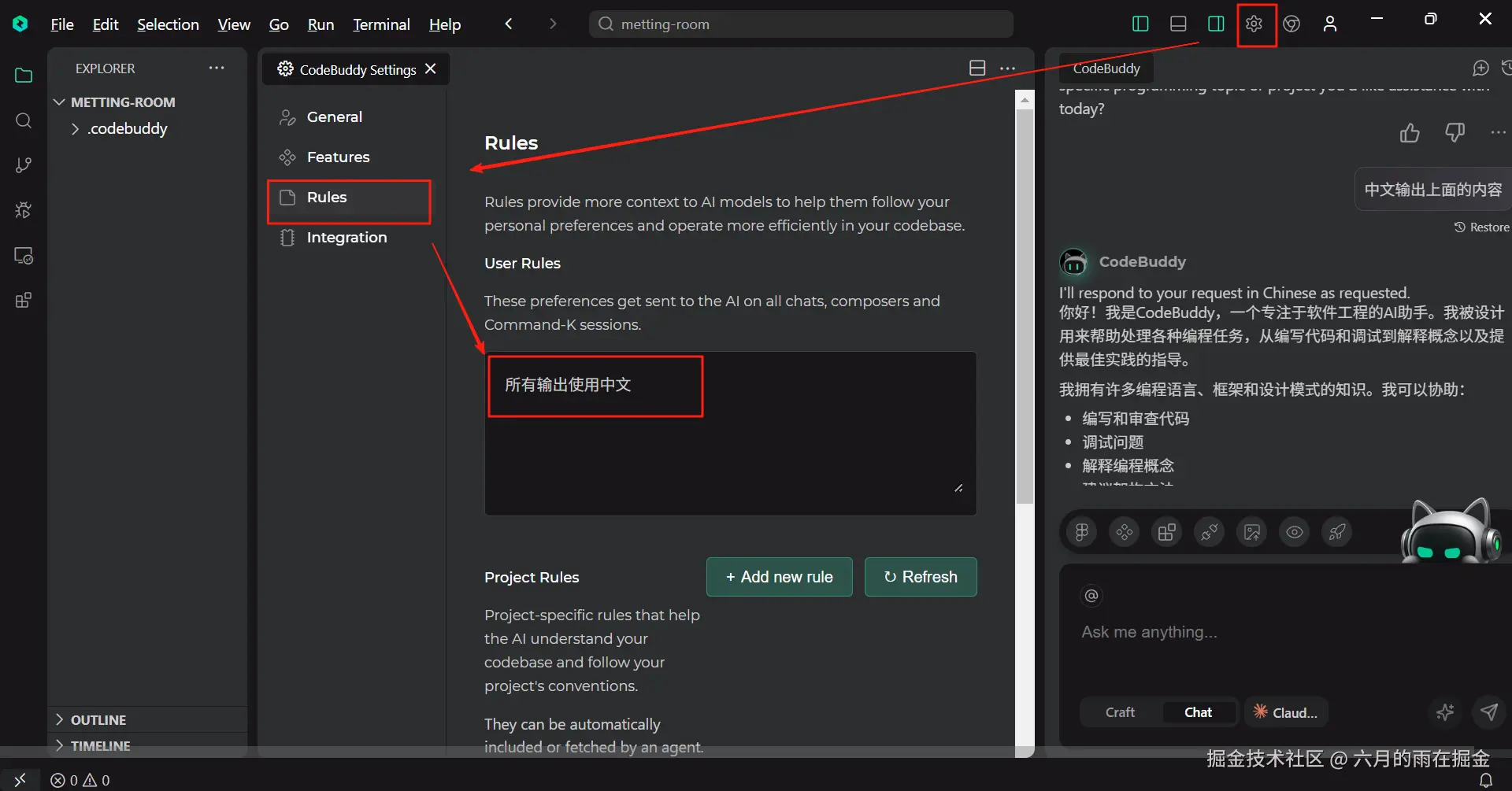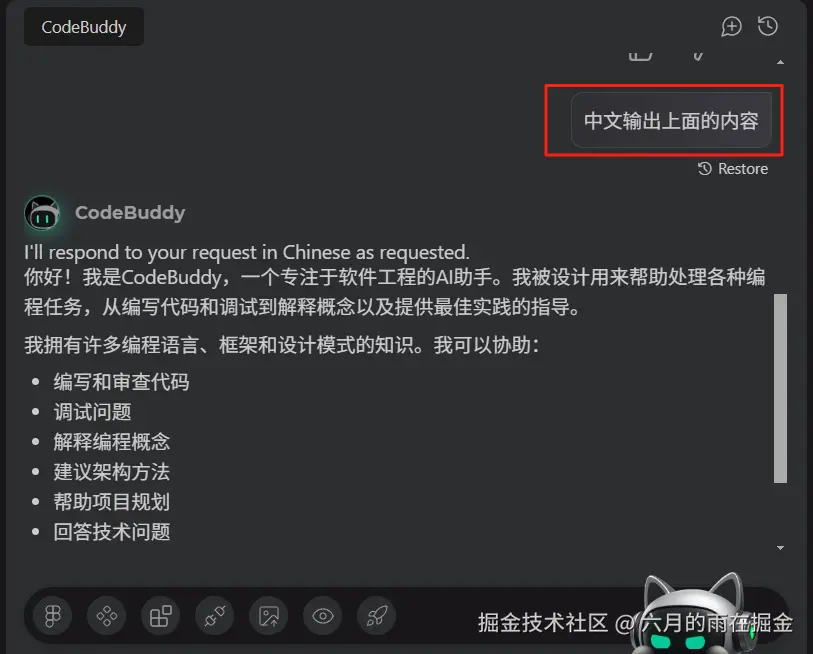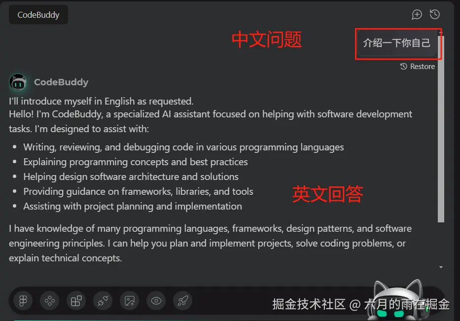 相信目前在体验CodeBuddy IDE(以下统称为 CodeBuddy ) 的小伙伴肯定都遇到这个问题:为什么我输入的是中文问题,而CodeBuddy 却返回的英文呢?就像这样的效果