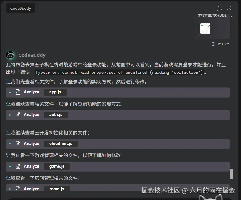 当然, 这些控制台报错对于开发者来说,不通过 AI 也可以自己处理,但是检查问题,分析问题的耗时往往是AI 处理的数倍,完全没有必要。因此,在面对报错信息时,我们可以选择复制报错信息在 AI 对话框,让AI 分析处理;或者像我们上面那样,通过截图的方式告诉AI 来处理问题,都是没问题的