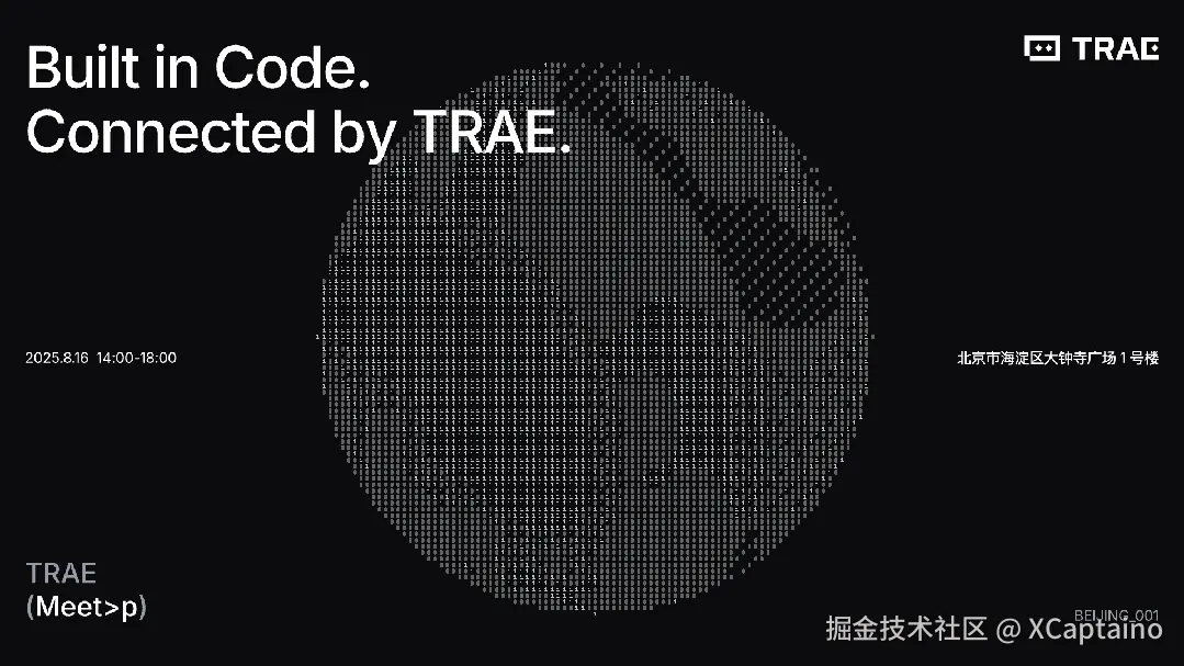 TRAE 首场 Meetup:8月16日,期待与你在北京相聚 XCaptaino 2025-08-11 1,552 阅读1分钟 报名地址:lu.ma/zzn73weq TRAE.ai2025年08月08日 21:34 北京