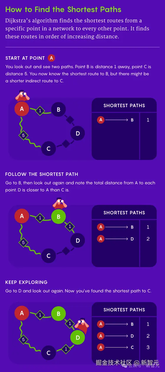 从起点开始,逐步探索网络中到每个点的最短路径——这种方法很有效,因为知道到附近节点的最短路径,能帮助你找到到更远节点的最短路径。