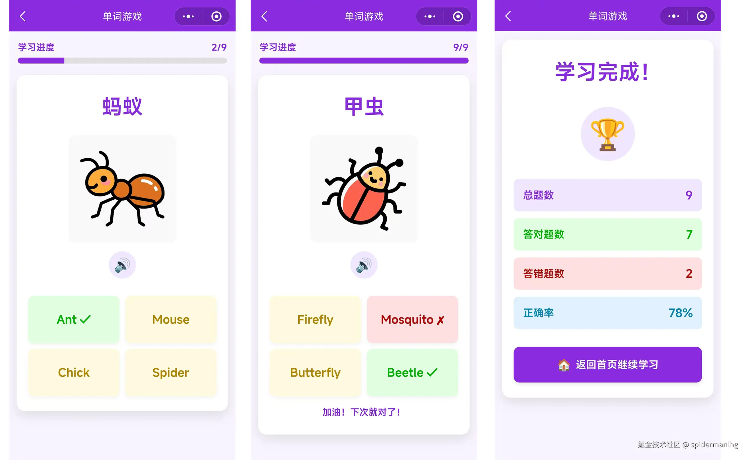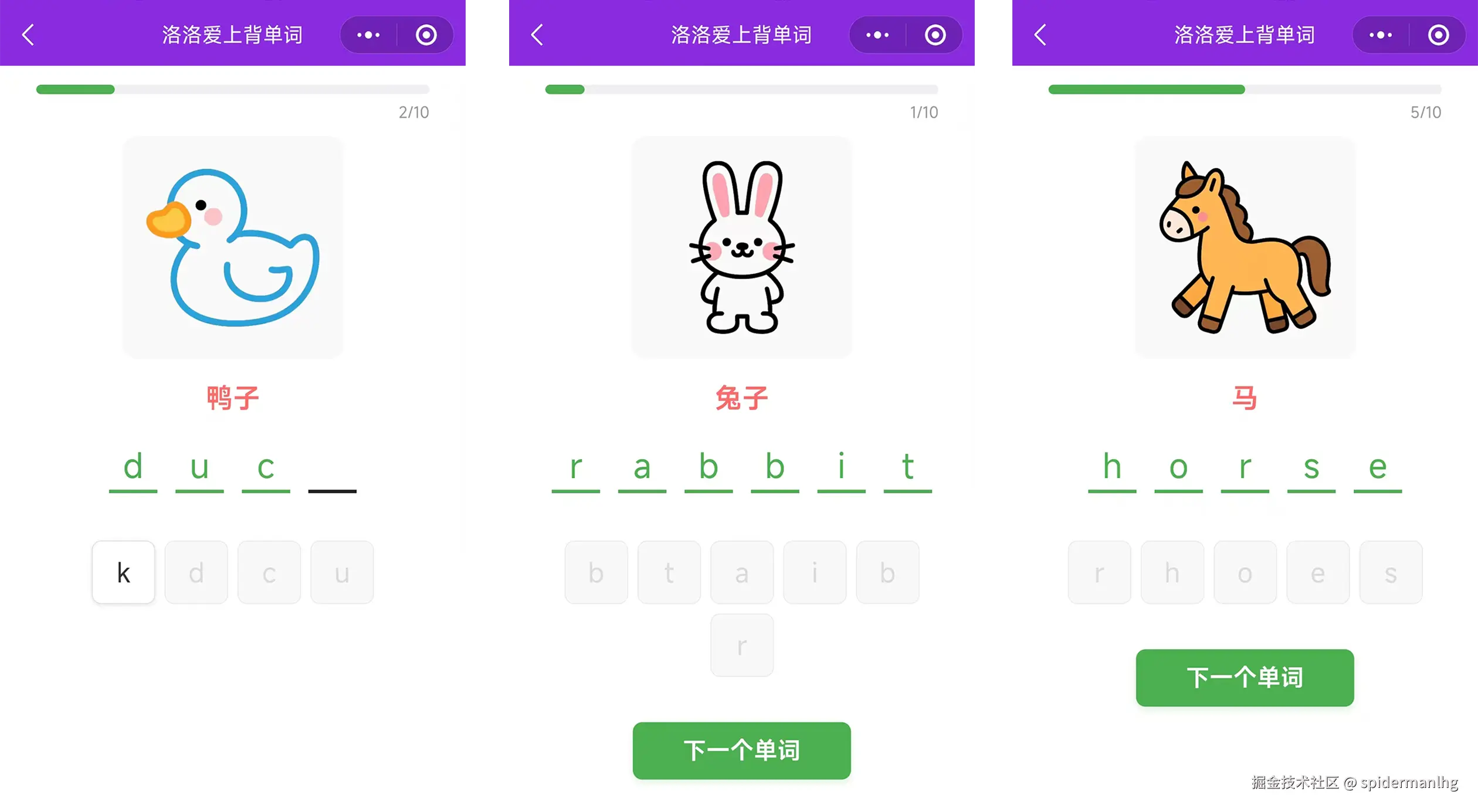 单词图片下面是打乱的字母排序,按单词正确顺序点击字母,选错字母的话,当前位置的横线会闪动变红色, 拼写成功后会显示“下一题”的按钮。这里有个小问题,当单词比较长的时候,字母选项就多,看着有点乱,应该是当字母特别长的时候,默认已经填写了几个字母,这样看起来会比较好一些。