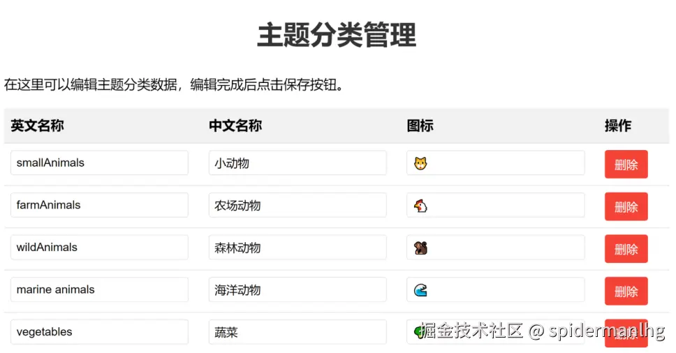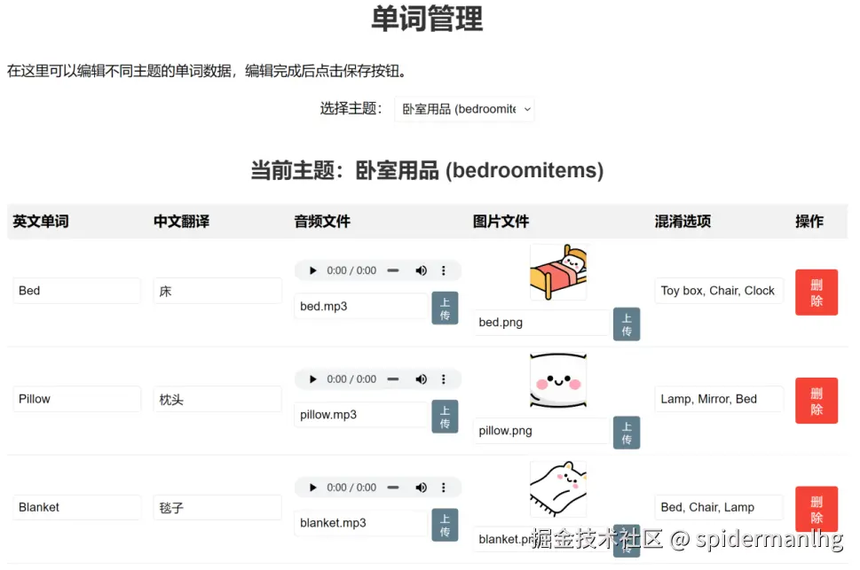 “管理单词”页面。这些单词都是coze批量生成的,如果对哪个单词的图片不满意,可以自己再单独生成更合适的图片。