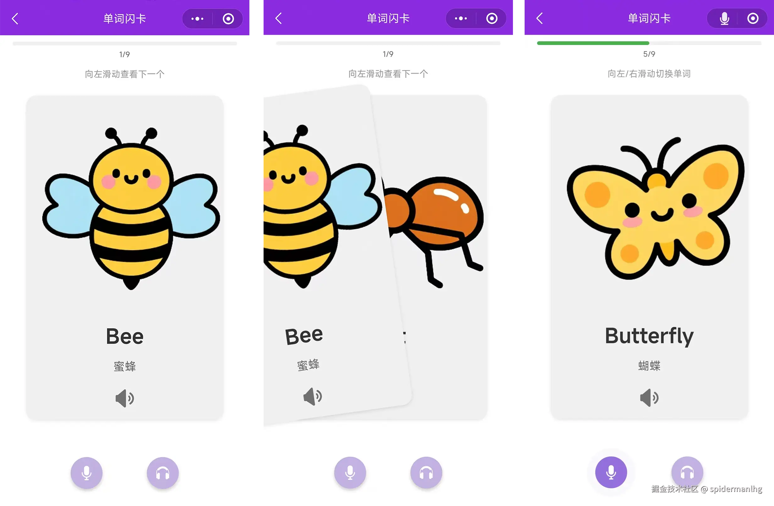 左右滑动图片可以切换单词闪卡。这个左右滑动的效果,滑动时图片倾斜的角度,以及滑动的位置,渐变的消失位置,我是尝试写了好几次提示词,最终才实现的。感兴趣的可以看首图有小程序码体验一下。 在写提示词的时候,要想用AI来实现好的效果,必须要有一些做产品的知识,否则你都不知道该怎么表达你的意图。