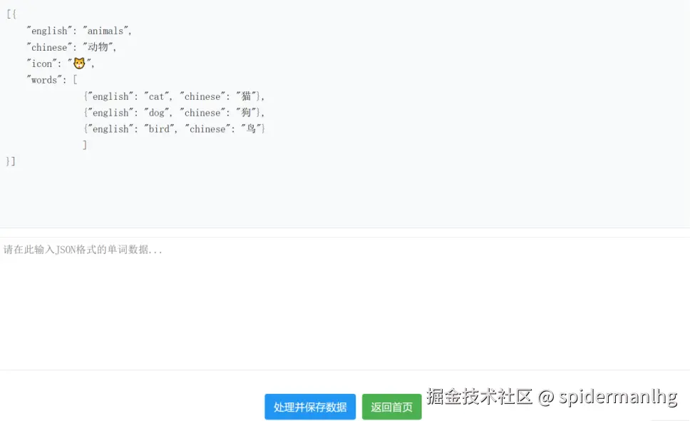 “批量导入”功能。 把这个json示例扔给Deepseek,或者其他AI工具,让他生成类似的json格式。然后把生成的json数据,放入到输入框中,点击“处理数据”按钮就可以批量生成对应的主题和单词。