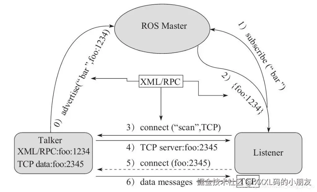 ROS Master 会根据注册表中的信息匹配Talker 和 Listener,并通过 RPC 向 Listener 发送 Talker 的 RPC 地址信息。