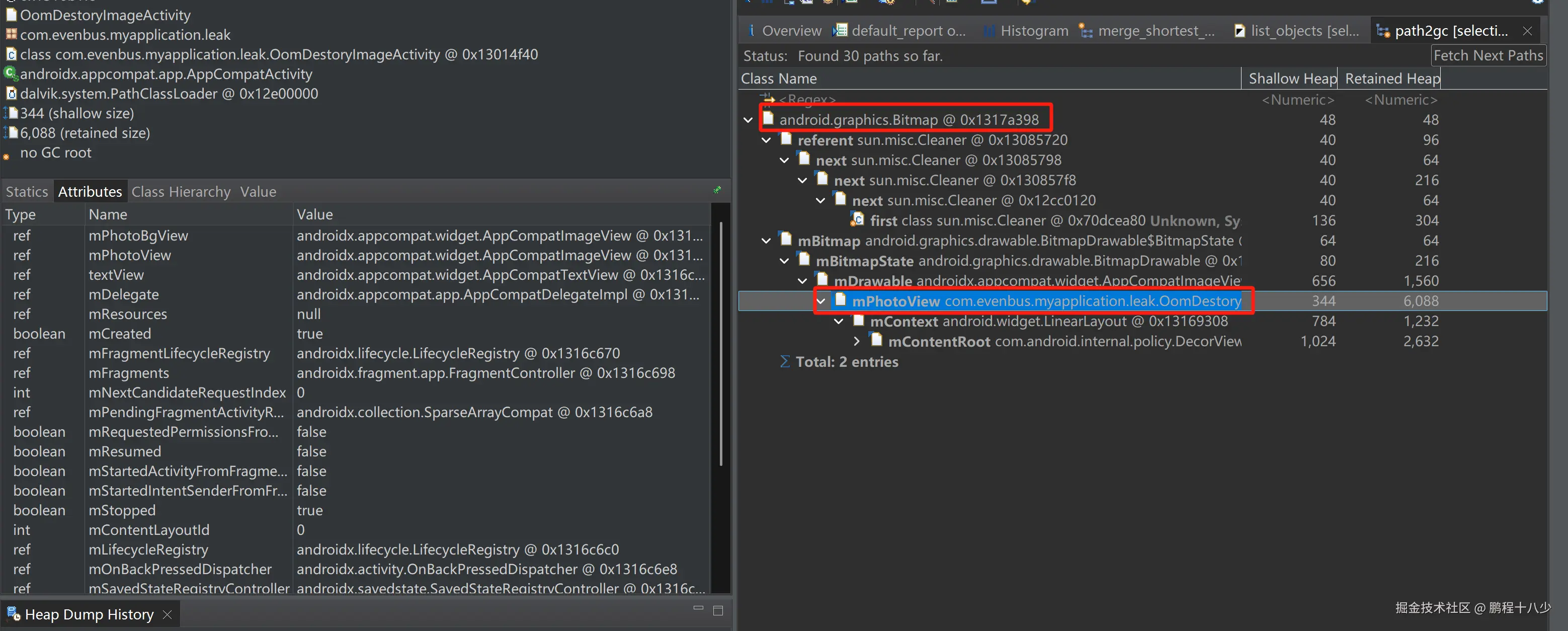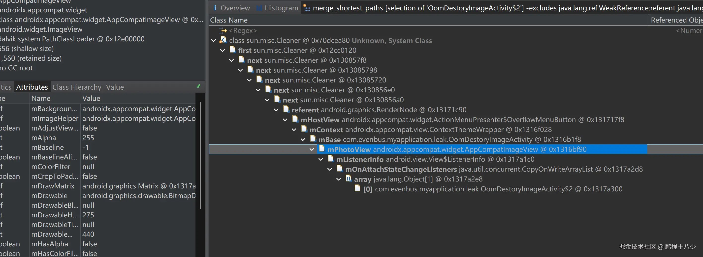 OomDestoryImageActivity ├─ mPhotoView: ImageView │ └─ mDrawable: BitmapDrawable │ └─ mBitmapState: BitmapDrawable$BitmapState │ └─ mBitmap: Bitmap@0x6a3d // 被ImageView持有 ├─ currentBitmap: Bitmap@0x6a3d // 被Activity直接持有 └─ loadImageTask: LoadImageTask // 可能未取消的任务