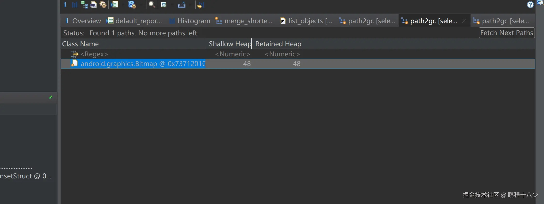 "elements": [ "static com.example.App.sImageCache", // 根源:静态缓存 "→ LruCache.mMap", "→ HashMap$Node.value", "→ OomDestoryImageActivity.currentBitmap" // 最终泄漏点 ]- 清晰展示从 GC Root 到泄漏对象的引用链