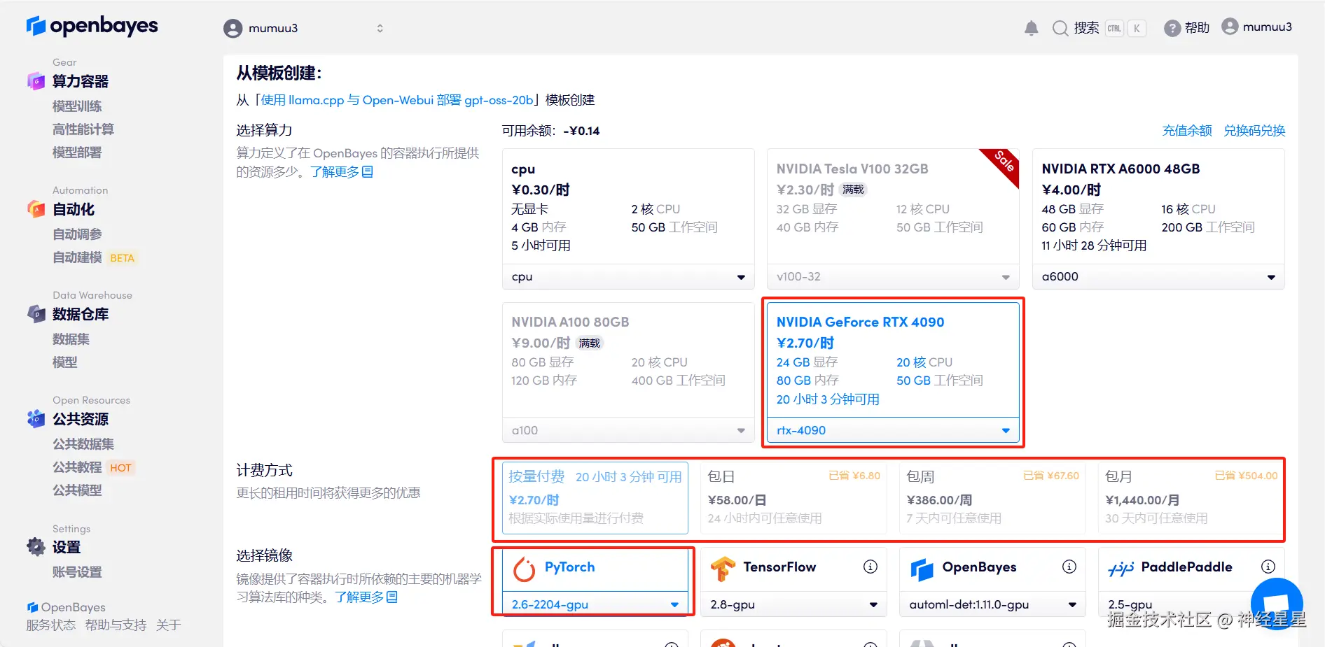 - 选择「NVIDIA GeForce RTX 4090」以及「PyTorch」镜像,按照需求选择「按量付费」或「包日/周/月」,点击「继续执行」。新用户使用下方邀请链接注册,可获得 4 小时 RTX 4090 + 5 小时 CPU 的免费时长!