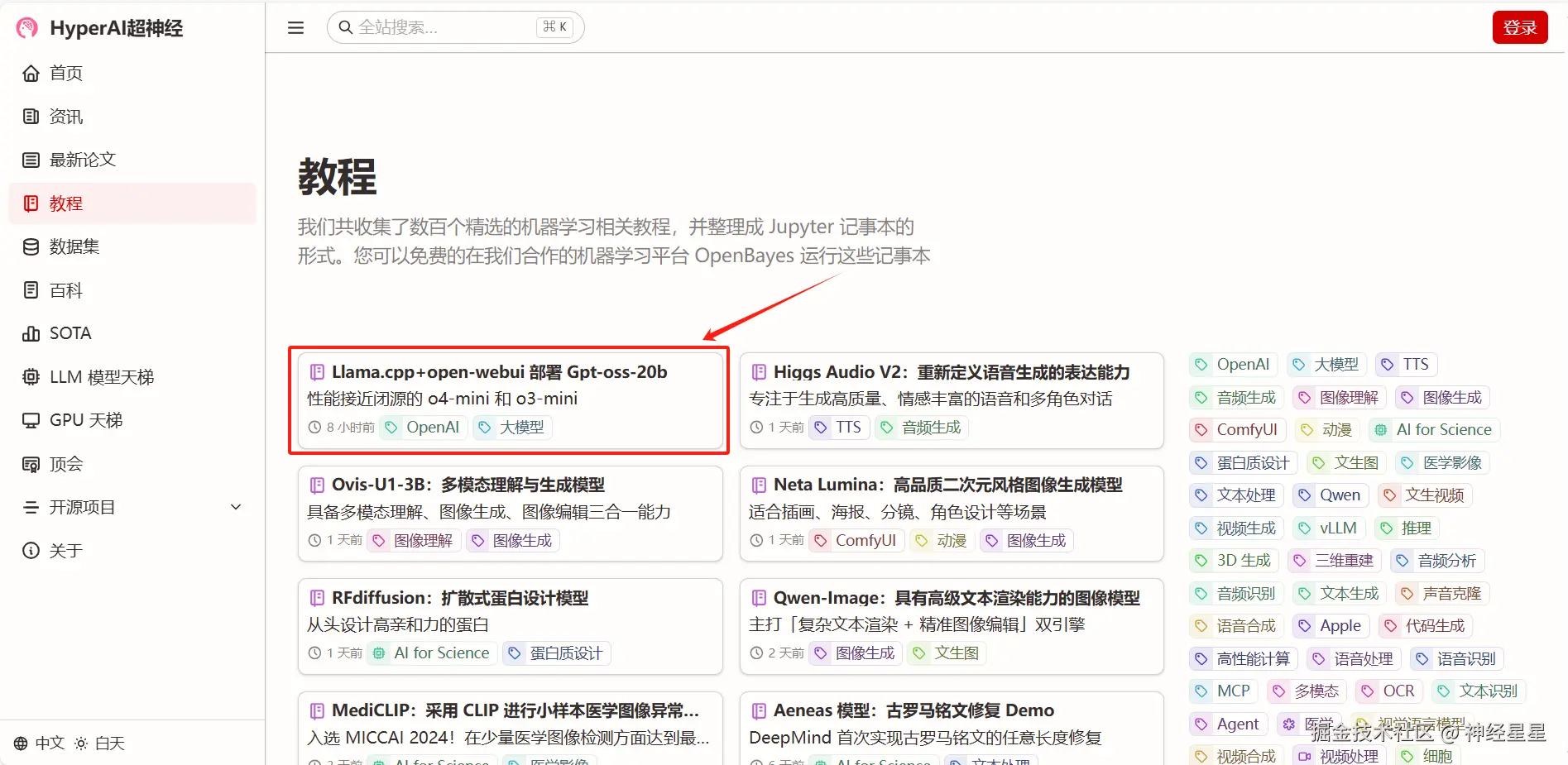 1. 进入 hyper.ai 首页后,选择「教程」页面,并选择「Llama.cpp+open-webui 部署 gpt-oss-20b」,点击「在线运行此教程」。