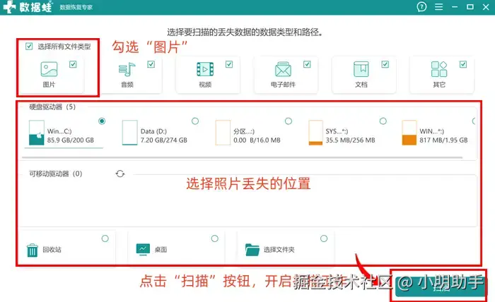 步骤1: 在软件的初始页面中,我们根据提示勾选好目标文件类型(找回照片可勾选“图片”),再勾选丢失照片的位置,选好后点击“扫描”。