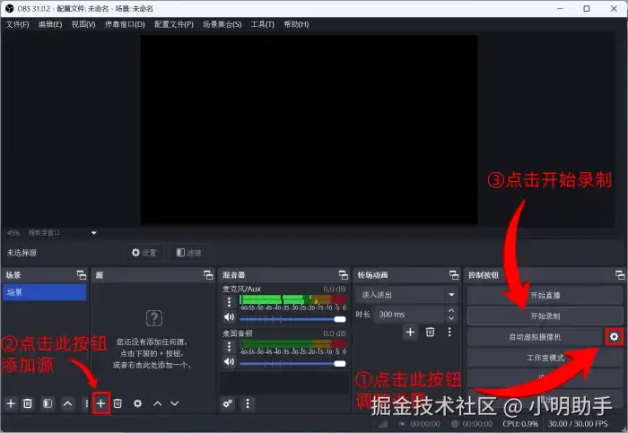 步骤①:在电脑上打开OBS Studio,调整需要的设置,添加需要录制的源。