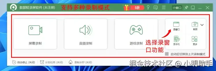 步骤①:在电脑上打开数据 蛙录屏软件,选择需要的录制模式,如“录窗口”功能。