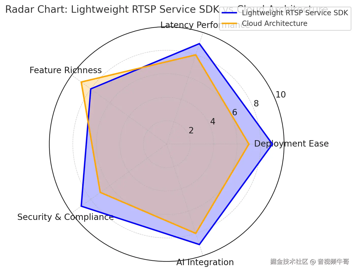 轻量级RTSP服务SDK和云架构在 Deployment Ease、Latency Performance、Feature Richness、Security & Compliance、AI Integration 五个维度的对比: