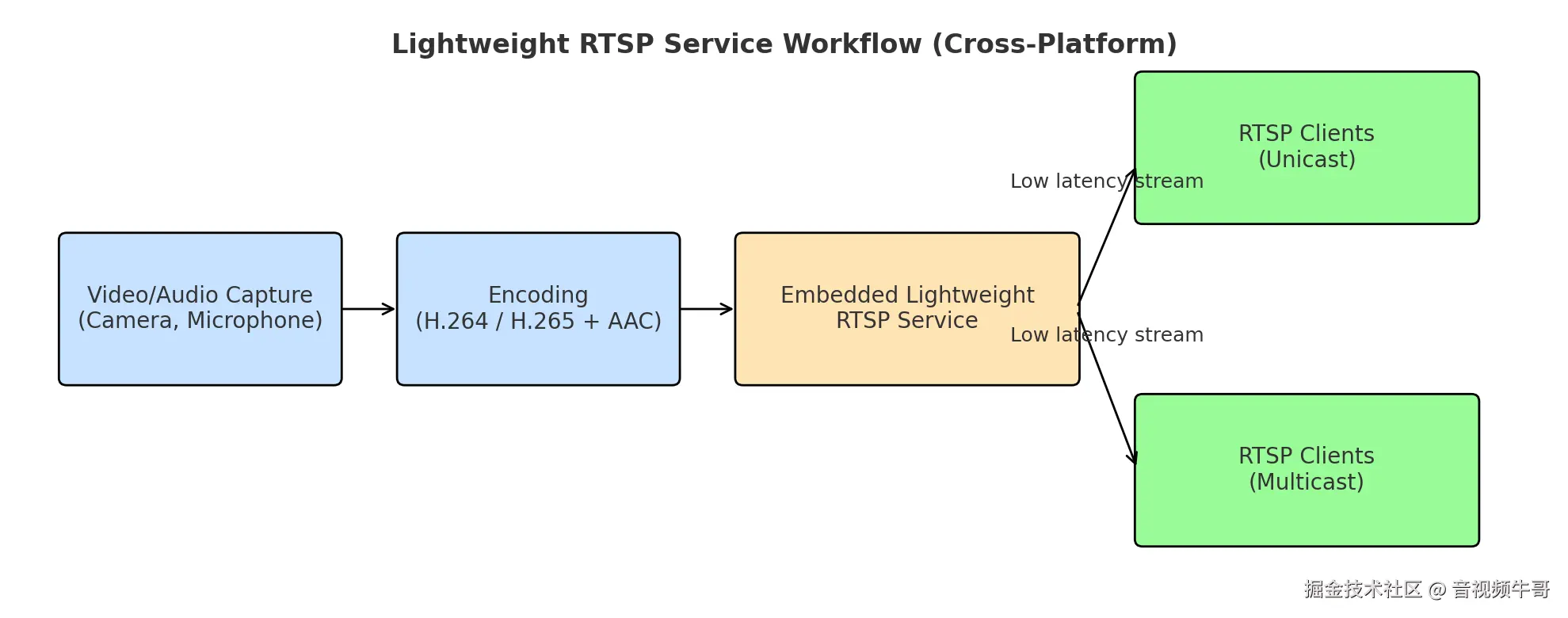 轻量级RTSP服务SDK的核心价值,在于将视频采集、编码、流媒体分发融为一体,形成了**“零中间节点”的端到端传输链路**,从而最大化降低延迟、简化部署。