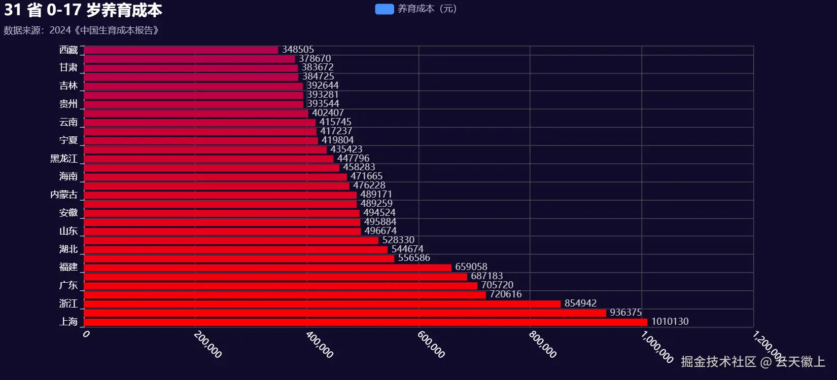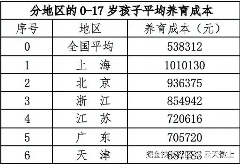 - 上海北京双峰突出:上海(101万)和北京(93.6万)的养育成本远超其他省份,是西藏(34.9万)的近3倍