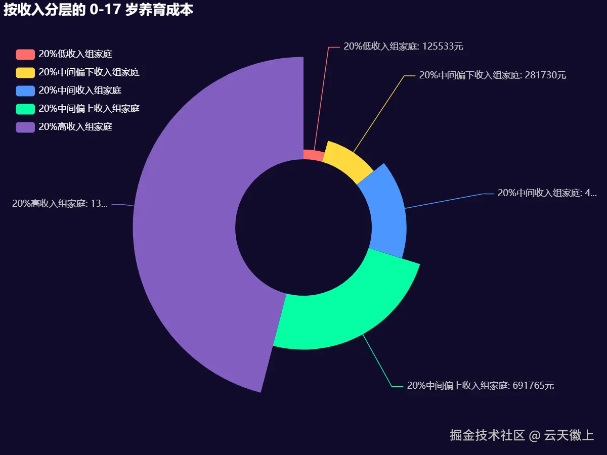 - 高收入组成本激增:高收入家庭(131.5万)的养育成本是低收入组(12.6万)的10.4倍