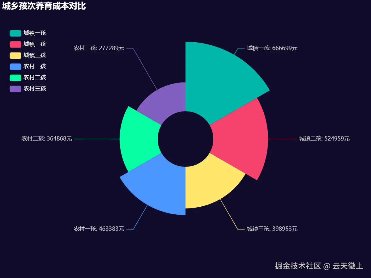 我们将创建六个图表:分地区的养育成本柱状图、养育成本地图、养育成本地图+柱状图、按收入水平区分的养育成本柱状图、全国城镇和农村分孩次养育成本stack柱状图、全国城镇和农村分孩次养育成本一孩,二孩,三孩比较的pie图。
