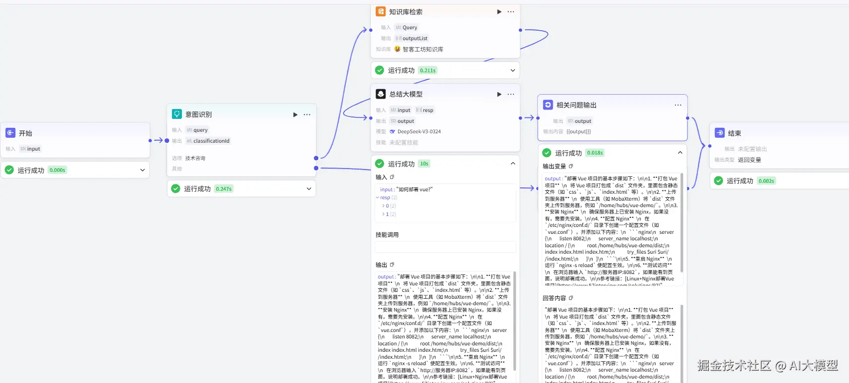 单击大模型节点,在右侧可以设置该节点相关信息,首先改名成"总结大模型",然后选择处理方式为单次,模型选择Deep-Seek-R3,输入共两个变量,第一个参数input的变量值为开始节点的input,第二个参数resp的变量值为知识库检索节点的outputList,然后设置用户提示词如下: