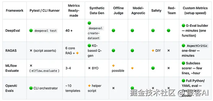 | MLFlow Evals | MLOps生态集成 | 已有MLFlow基建的团队 | ⭐⭐ |