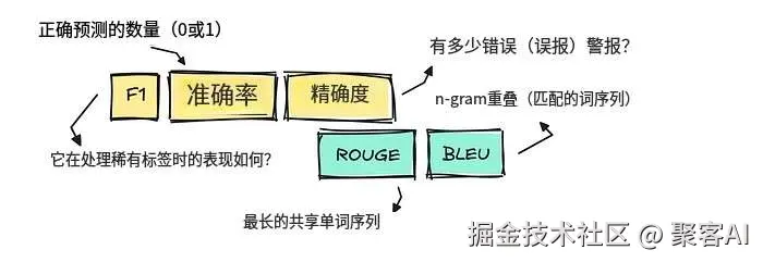 - 精确匹配型指标:准确率(Accuracy)、F1值在分类任务中仍有效,但依赖单标准答案