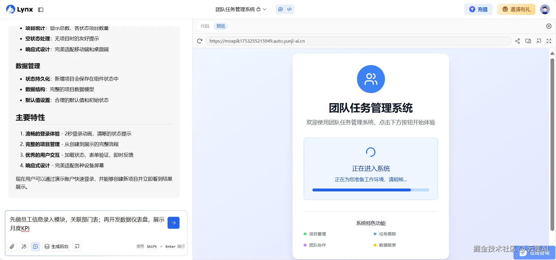比如做一个企业内部管理系统,你只需分步骤告诉Lynx:“先做员工信息录入模块,关联部门表”“再开发数据仪表盘,展示月度KPI”,它会像搭积木一样逐步完善功能,最终交付的应用不仅能跑通全流程,还预留了扩展接口,方便后续迭代。