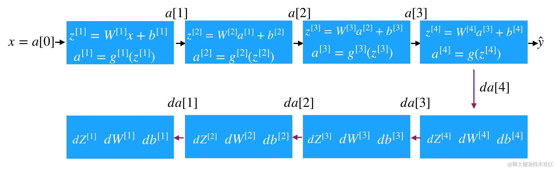 z[4]=W[4]a[3]+b[4],a[4]=σ(z[4])z^{[4]} = W^{[4]}a^{[3]}+b^{[4]},a^{[4]}=\sigma(z^{[4]})z[4]=W[4]a[3]+b[4],a[4]=σ(z[4])a[3]a^{[3]}a[3]a[4]a^{[4]}a[4]