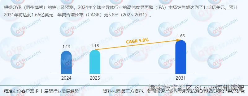 本报告基于QYResearch等权威机构数据,系统分析全球半导体行业高纯度异丙醇(IPA)市场的供应链结构、竞争格局、区域分布及技术趋势。根据QYResearch最新调研报告显示,2024年全球市场规模达1.13亿美元,预计2031年增至1.66亿美元,CAGR为5.8%;中国作为核心增长极,2024年市场份额占全球的43%,预计2031年占比将提升至48%。技术端,超高纯级(>99.99%)产品主导市场,半导体制造领域需求占比达59%,且未来五年CAGR达7.2%。本报告为投资者提供产能布局、技术迭代及区域市场进入策略的决策依据。