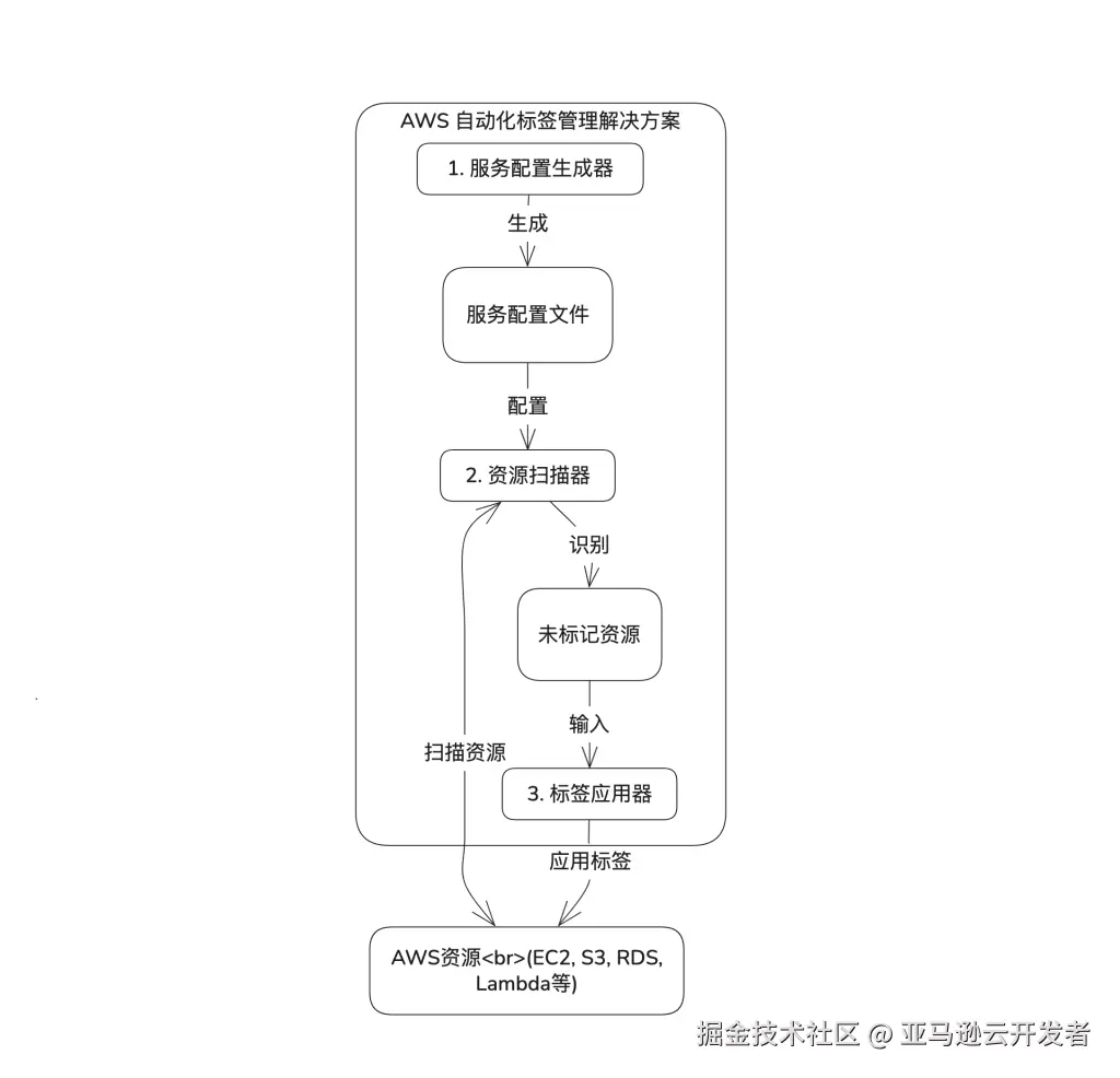 服务配置生成是解决方案的基础环节。为了有效扫描和标记资源,系统需要了解每种亚马逊云科技服务的资源类型及其 API 交互方式。亚马逊云科技服务的异构性和复杂性(如不同的 API 结构、资源标识符格式、标签支持差异)是该环节面临的主要挑战。